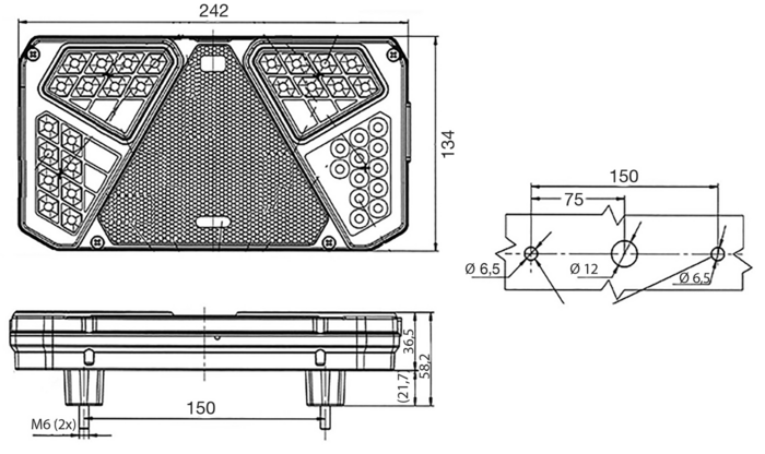 | Funzioni | Luce di posizione, luce stop, retromarcia, retronebbia, indicatore di direzione, catarifrangente triangolare |