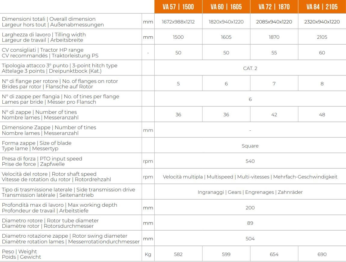 La serie VA è adatta a trattori da 50 a 60 hp con attacco di categoria 2.