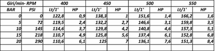 | Giri al minuto max - Pompe a bassa pressione | 550 rpm |