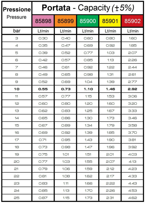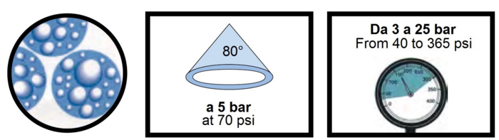 | Pressione di esercizio - Ugelli a cono antideriva | 3 Bar |