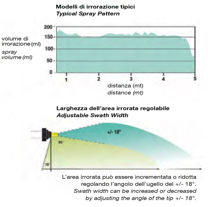 Materiali acciaio inossidabile AISI316, attacco filettato. Ideali per trattamenti di frutteti, vigneti, boschi, pascoli, prati, campi da golf.